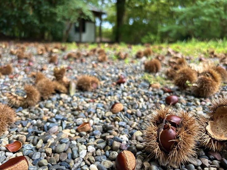 たくさんの栗と毬(イガ)が落ち、秋の風情を感じられます。