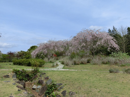 昇運庭では枝垂桜も満開になり、あじさい山を彩っています。